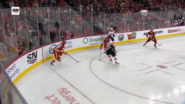 Watch as Calgary Flames forward Matthew Tkachuk finishes a beautiful passing play from teammates Sean Monahan and Elias Lindholm on Philadelphia Flyers goaltender Carter Hart.