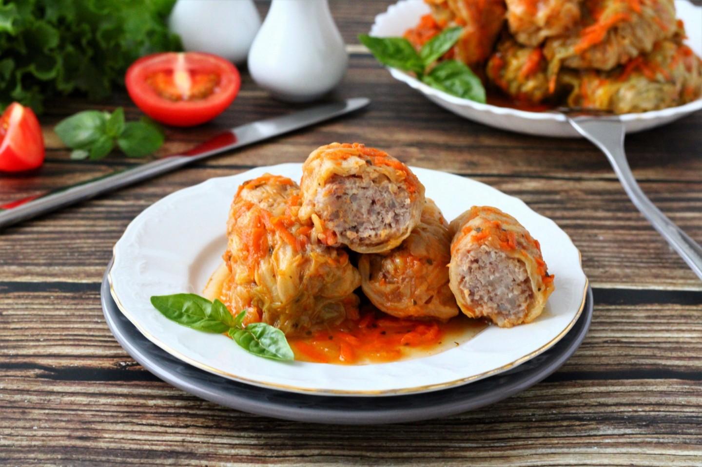 Капуста белокочанная 1.5 кг Морковь 2 шт. Лук репчатый 5 шт. Томатная паста80 гр Растительное масло4 стол.л. Фарш мясной850 гр Рис50 гр Сольпо вкусу Перец черный молотыйпо вкусу Базилик1 чайн.л. Паприка1 чайн.л. Лавровый лист2шт