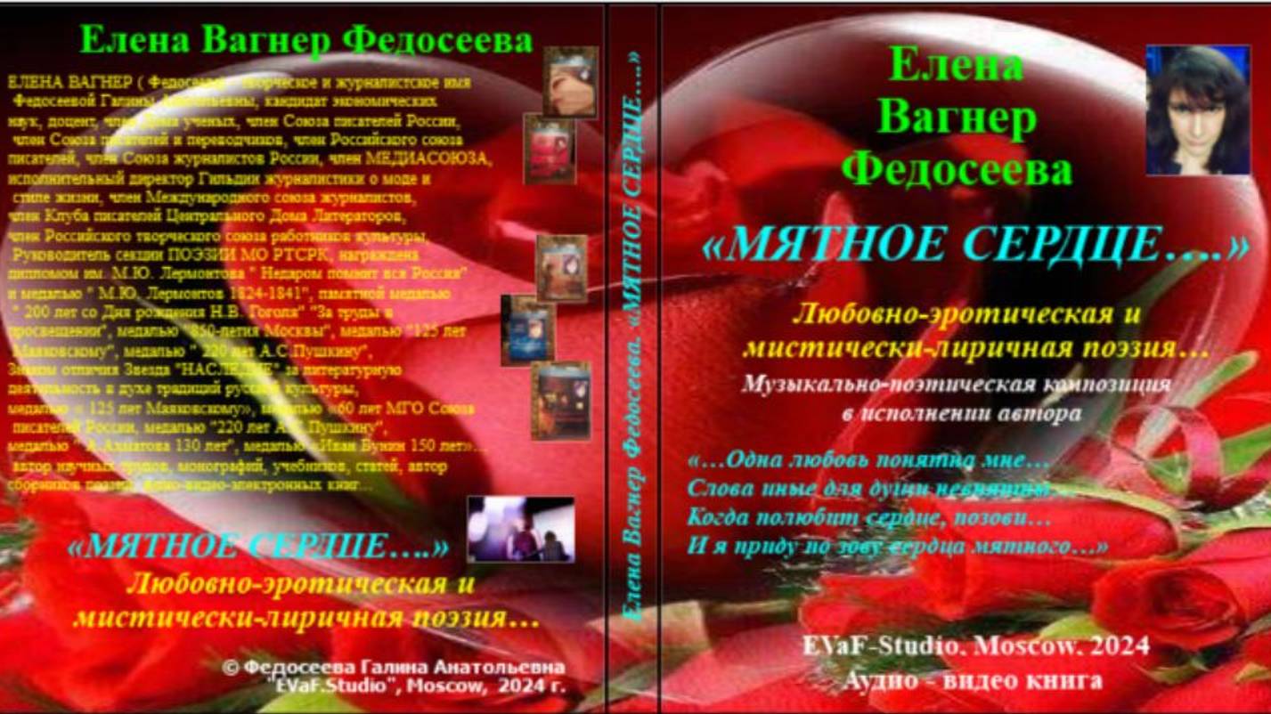 Helena Vagner Fedoseeva Открываем "плей-лист" в первые дни Нового 2024 года! Кто-то, вероятно, на каникулах... Но у меня первая в 2024 году аудио-видео-книга. Долгожданная, конечно... Я получила удовольствие от озвучки поэтических текстов и словно бы окунулась в 2017-2021 гг., когда они были мной написаны. 01 01 2024, Мск. ЕВФ. Представляю мою новую аудио-видео-книгу. Её можно приоьрести в личное пользование в 2х вариантах: 1 . По почте России - диск в подарочном исполнении. 2. По мэйлу после оплаты в виде аудио-видео -файлов, их можно закачать в любой гаджет и смотреть, слушать или читать ) в любое время!!) ПИШИТЕ! Елена Вагнер Федосеева «МЯТНОЕ СЕРДЦЕ….» Любовно-эротическая и мистически-лиричная поэзия… «…Одна любовь понятна мне… Слова иные для души невнятны… Когда полюбит сердце, позови… И я приду по зову сердца мятного…» Музыкально-поэтическая композиция в исполнении автора. Аудио& видео книга EVaF-Studio, Moscow, 2024. Дорогие друзья! Зову Вас в любовно-мистические миры поэзии чувств и мыслей, о которых, пожалуй, не стоит говорить вслух… Их надо проживать и чувствовать… Стихи написаны мной в период 2017-2021 годов. Это истории любовно-эротических чувств и настроений…. Я приглашаю Вас в Страну Любви, дверь в которую открывается только любовным ключом сердца… Мятного сердца… Эти любовные поэтические истории, которые я Вам доверительно рассказываю предназначены только для тех, кто верит в любовь, мистику, чувственность и чувствительность энергетических эфирных пространств…для тех, кому любовное пространство чувств окажется близким и доступным… Приятного настроения при прослушивании моих поэтических откровений… С любовью, автор, Елена Вагнер Федосеева. МЯТНОЕ СЕРДЦЕ СОДЕРЖАНИЕ 1. Хотелось обнажить всю суть… 2. В далеком прошлом…где-то ТАМ.. 3. Я помню полдень… май… весна… 4. Вальяжность мыслей…и нежность звуков… 5. Рассвет алеет словно паруса… 6. Влюбленность легкая…прошло три года… 7. Я понимаю лишь язык любви… 8. Где-то волны ласкают лодыжки… 9. Люблю любовь…и негу, нежность… 10. Я не люблю старинных писем… 11. Твой голос нежный, ласковый и томный… 12. Я вновь о нежности пою… 13. Заветное имя храню в глубине… 14. Любовь земная… волшебство стихий… 15. Ты – в дар мне… ты – награда от Богов… 16. Я люблю тебя в странах далеких… 17. Когда ты с нежною заботой… 18. Мечтаю я о чистой ласке… Длительность аудио-текста 60 мин. Для инфо: ЕЛЕНА ВАГНЕР ( Федосеева) - творческое и журналистское имя Федосеевой Галины Анатольевны,кандидат экономических наук, доцент, член Дома ученых, член Союза писателей России, член Союза писателей и переводчиков, член Российского союза писателей, член Союза журналистов России, член МЕДИАСОЮЗА, исполнительный директор Гильдии журналистики о моде и стиле жизни, член Международного союза журналистов, член Клуба писателей Центрального Дома Литераторов, член Российского творческого союза работников культуры, Руководитель секции ПОЭЗИИ МО РТСРК, награждена дипломом им. М.Ю. Лермонтова " Недаром помнит вся Россия" и медалью " М.Ю. Лермонтов 1824-1841", , памятной медалью " 200 лет со Дня рождения Н.В. Гоголя" "За труды в просвещении", медалью "850-летия Москвы", медалью "125 лет Маяковскому", медалью " 220 лет А.С.Пушкину", Знаком отличия Звезда "НАСЛЕДИЕ" за литературную деятельность в духе традиций русской культуры, медалью « 125 лет Маяковскому», медалью «60 лет МГО Союза писателей