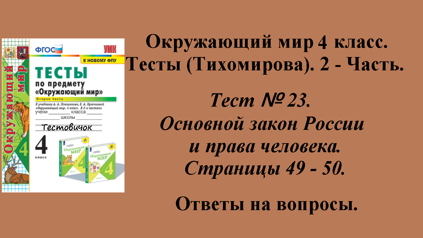 Ответы к тестам по окружающему миру 4 класс (Тихомирова). 2 - часть. Тест № 23. Основной закон России и права человека. Страницы 49 - 50.