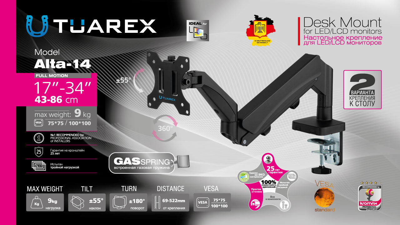 Настольный кронштейн для крепления телевизоров и мониторов TUAREX ALTA-14 BLACK надёжно удержит экран размером 15"-34" дюйма и весом от 1 до 9 кг. Наклонно-поворотная регулировка позволит вращать экран на 360°, наклонять вверх и вниз на ±55°, и поворачивать влево и вправо на ±180° – для оптимального угла зрения и удобной посадки. TUAREX ALTA-14 BLACK имеет настольный тип установки с механизмом защиты от падения. Крепёжные отверстия настольного кронштейна TUAREX ALTA-14 BLACK изготовлены по международному стандарту VESA. Кронштейн подходит для большинства мониторов популярных брендов, среди которых Samsung, LG, Sony, Panasonic, Sharp, Toshiba, Dell, ASUS, HP, Acer, BenQ, MSI, Philips, Lenovo, Sceptre, ViewSonic, Gigabyte, AOC, Viotek и других. В комплектацию TUAREX ALTA-14 BLACK входят необходимые для монтажа материалы. Вся продукция обеспечивается гарантийными обязательствами. Подробнее: https://www.kromax.ru/produce/the_brackets_for_the_1st_monitor/13001/