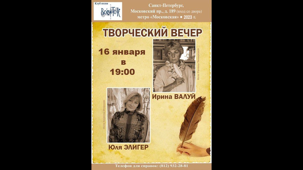 Ирина Валуй. Юля Элигер. Творческая встреча. Клуб песни «Восток». 16 января 2023 г. Санкт-Петербург, Московский пр., д. 189. Афиша - Елена Демьянова-Семененко. Видеозапись - Алла Левитан. Запись звука - Герман Колосов.