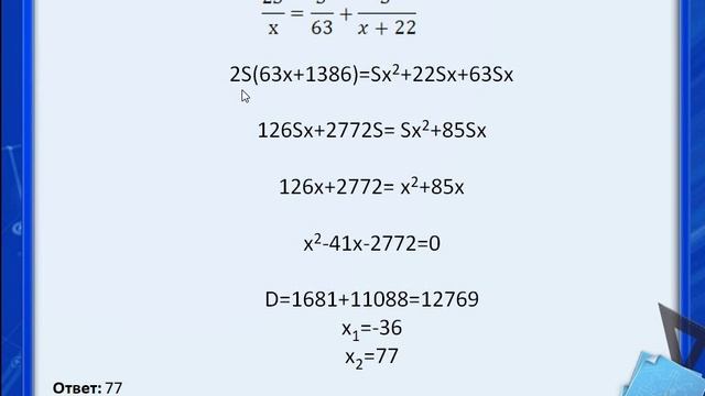 Из пункта А в пункт В одновременно выехали два автомобиля. Первый проехал с постоянной скоростью весь путь. Второй проехал первую половину пути со скоростью 63 км/ч, а вторую половину пути — со скоростью, большей скорости первого на 22 км/ч, в результате чего прибыл в В одновременно с первым автомобилем. Найдите скорость первого автомобиля. Ответ дайте в км/ч. Дорога между пунктами А и В состоит из подъёма и спуска, а её длина равна 36 км. Путь из А в В занял у туриста 10 часов, из которых 2 часа ушло на спуск. Найдите скорость туриста на спуске, если она больше скорости на подъёме на 3 км/ч. Ответ дайте в км/ч.