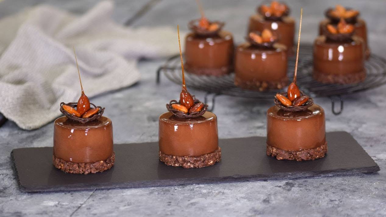 автор: @mariko Муссовое Пирожное "Три орешка" Ингредиенты (на 8 шт.) Для начинки: миндальное пралине - 140 г Ссылка на рецепт пралине (вместо фундука используйте миндаль) • Ореховая паста "Пралине" https://rutube.ru/video/4fb82e1bd25dbdf2d7971983f17123a4/ Для шоколадного мусса: яичные желтки - 2 шт. молоко - 100 мл сливки 33-35% - 50 мл сахар - 25 г растопленный темный шоколад - 60 г растопленный молочный шоколад - 60 г охлаждённые сливки 33-35% - 270 мл желатин - 7 г холодная вода - 40 мл Для песочного теста: размягченное сливочное масло - 100 г сахарная пудра - 60 г мука - 240 г разрыхлитель - 3 г соль - щепотка яйцо - 1 шт. растопленный темный шоколад - 60 г растопленный молочный шоколад - 60 г Для украшения: Шоколадная зеркальная глазурь темперированный темны шоколад - 50 г миндаль в карамели - 50 г Ссылка на рецепт зеркальной глазури • Шоколадная зеркальная глазурь https://rutube.ru/video/dec69bf746c18924bd2504074056059a/ 1) Приготовить миндальное пралине по указанному рецепту. Заполнить 8 ячеек формы начинкой. Я использовала форму Silikomart SF005 (40мм,h20мм,20мл). Убрать форму в морозильную камеру на 2 часа. 2) Приготовить шоколадный мусс. Желатин залить холодной водой и оставить на 10 минут для набухания. В сотейнике взбить желтки с сахаром до однородности. Затем влить молоко и сливки, хорошо перемешать. Поставить на средний огонь и, все время интенсивно перемешивая венчиком, нагреть до 82°С, смесь должна слегка загустеть. Снять с огня, добавить разбухший желатин и хорошо перемешать до полного растворения желатина. Полученную массу перелить в миску и добавить растопленный темный и молочный шоколад, хорошо перемешать до однородной массы. Охлажденные сливки взбить миксером до мягких пиков. Постепенно ввести взбитые сливки в шоколадную массу. 3) Заполнить ячейки формы муссом наполовину. (Я использовала силиконовую форму "цилиндр" Silikomart SF119 (d63мм,h40мм,123мл). 4) Достать из морозилки замороженное пралине. Вынуть из формы и утопить в муссе. (С замороженным пралине нужно работать быстро, так как при комнатной температуре пралине быстро размораживается). Сверху залить муссом и убрать пирожные в морозильную камеру на 6-8 часов. 4) Приготовить песочное тесто. В миске смешать муку, разрыхлитель и соль. Отложить в сторону. Размягченное сливочное масло взбить миксером вместе с сахарной пудрой, в течение 1 минуты. Затем добавить яйцо и хорошо перемешать до однородной массы. Добавить муку и замесить тесто. Завернуть тесто в пленку и убрать в холодильник на 1 час. 5) Разогреть духовку до 170 °С. 6) Натереть тесто на крупной терке и равномерно распределить его по двум противням. 7) Выпекать в разогретой духовке 12-15 минут, до слегка золотистого цвета. 8) Готовую песочную основу остудить до комнатной температуры, затем руками измельчить в крошку. 9) Для рецепта понадобится 200 г песочной крошки. В миске соединить песочную крошку, растопленный молочный и темный шоколад, хорошо перемешать. 10) В кольцо диаметром 7 см поместить 1,5 ст.л. песочной крошки и хорошо утрамбовать. Аккуратно извлечь кондитерское кольцо и сделать еще 7 таких основ. Убрать в холодильник, чтобы шоколад застыл. 11) Покрыть пирожные глазурью. На противень или большую плоскую тарелку положить решетку. Достать пирожные из морозильной камеры. Вынуть из силиконовой формы и выложить на решетку. 12) Каждое пирожное равномерно полить глазурью. Оставить пирожные на решетке, еще на несколько минут чтоб излишки глазур