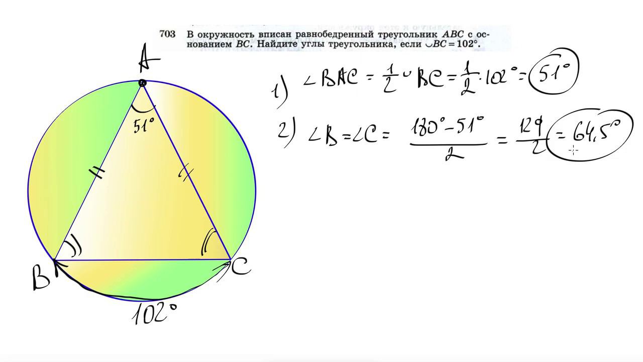 №703. В окружность вписан равнобедренный треугольник ABC с основанием ВС. Найдите углы треугольника