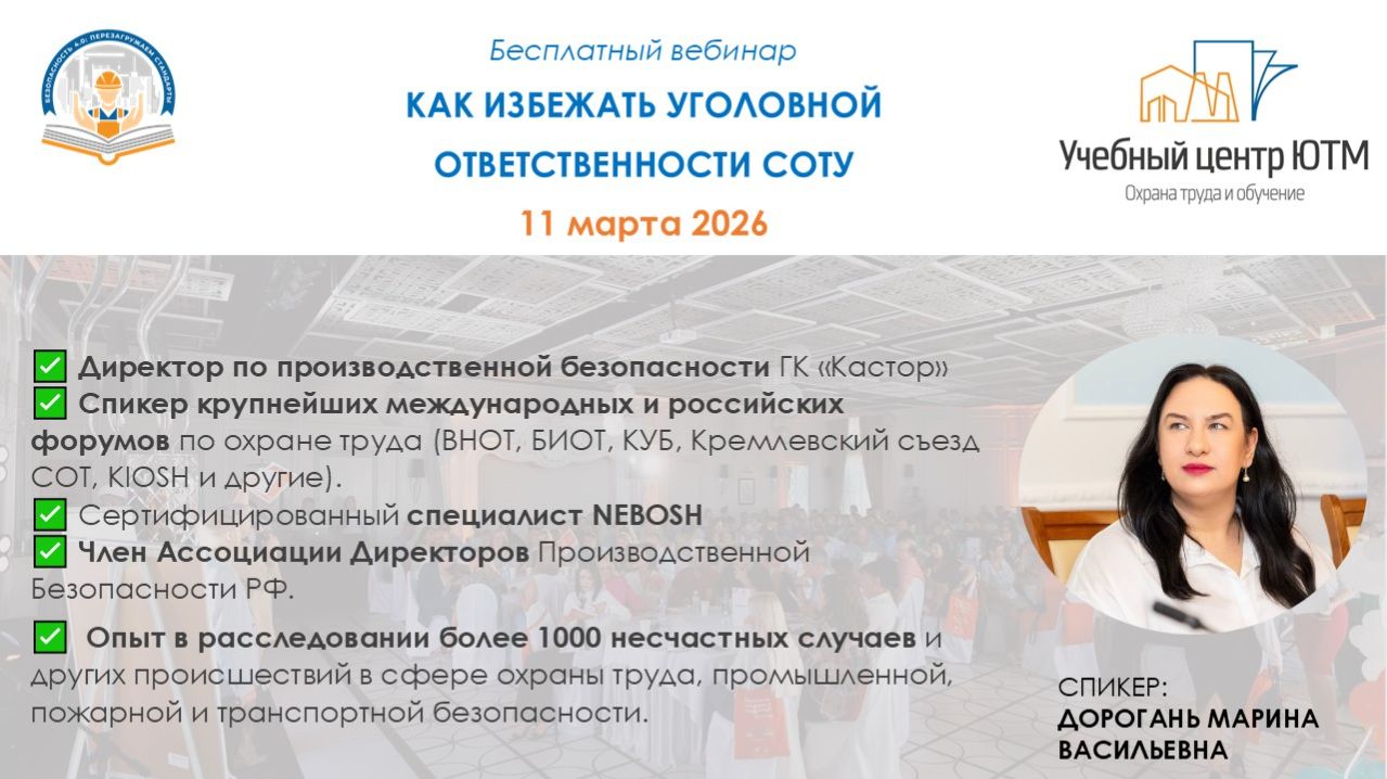 Марина Дорогань рассказала и дала советы через призму ежедневной работы, процедур, локальных актов, бездействия и выполнения работы за всех, кроме себя (СОТа) ➡Разобрали, как сформировать документацию как для исключения уголовной ответственности специалист по охране труда, так и риски компании в сфере производственного травматизма. ➡Актуализировали информацию, которую НЕ должна содержать должностная инструкция специалиста по охране труда, а также затронем систему управления охраной труда. ➡Поняли взаимосвязь между назначением ответственности за охрану труда в компании и основаниями возбуждения уголовного дела за нарушения требований охраны труда. Если у Вас остались вопросы, и Вы хотите обсудить их пишите в наш Телеграмм чат https://t.me/liga_bezopasnosty https://centr-utm.ru/