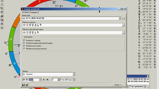 Функционал "Сканер аспектов" в астрологической программе Sotis (версия desktop)