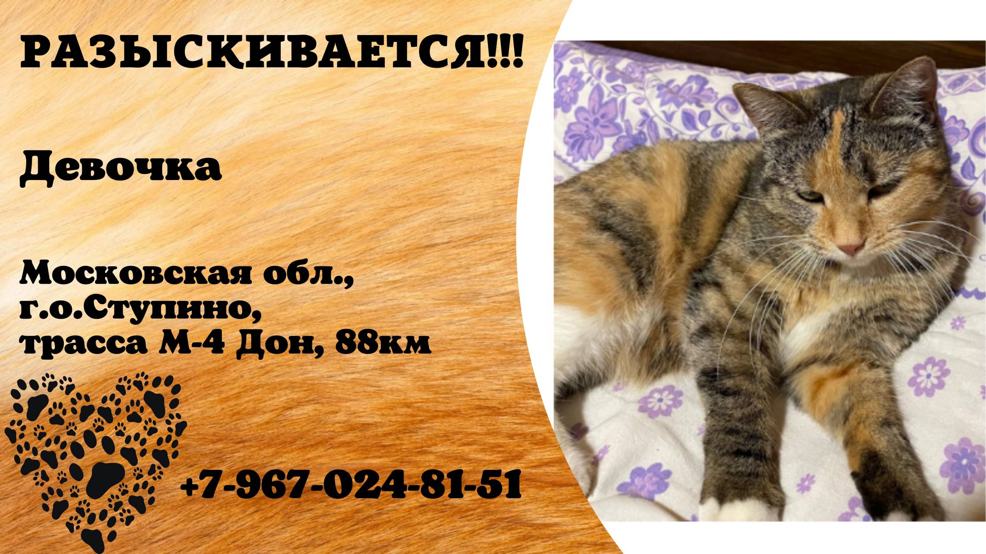 Московская Москва Пропала кошка Поиски продолжаются!20.09.24г.,пропала кошка МО гор.округ Ступино на трассе М-4 Дон 88-й км. Сломалась машина, кошка вышла, не смогли найти, периодически ездим сами, объявление расклеены. Рядом с трассой кафе, магазин…Недалеко снт: Починки, дружба, Забелино, Мурзино. Кличка: Сестра, 3 года, стерилизована. Окрас: тигровый, трехцветная. Был одет ошейник от клещей серого цвета. Кто увидит, просьба: приманить, приютить. Срочно сообщить.Вознаграждение.89670248151 Светлана Автор https://vk.com/id137125596 Инфо https://vk.com/wall-198815410_157289
