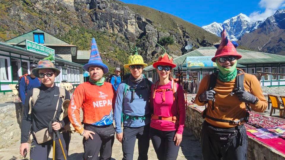 Группа Клуба 7 Вершин "70е" на переходе из Намче-Базара в Дебоче по пути в базовый лагерь Эвереста. Октябрь 2024 года.Гид Андрей Березин. "Сегодня мы покинули прекрасную столицу шерпов Намче-Базар и отправились в Дебоче. По пути посетили буддийский монастырь. Также увидели первый раз Эверест, погода весь день ясная".