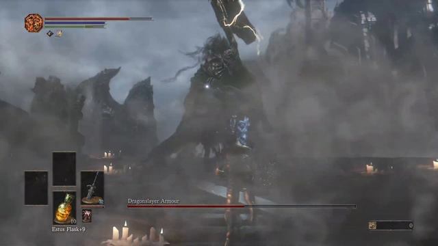 Dark Souls III - Soul Level 1 Mod : The Convergence 2.2.1 Boss : Dragonslayer Armour Weapon : Wolf Knight's Greatsword (Raw infusion) +10 (2H) Armor set : Firekeeper (head) & Armor of Favor (partial) (+5 VGR, +1 LCK, +4 END, +4 VIT) Shield : no