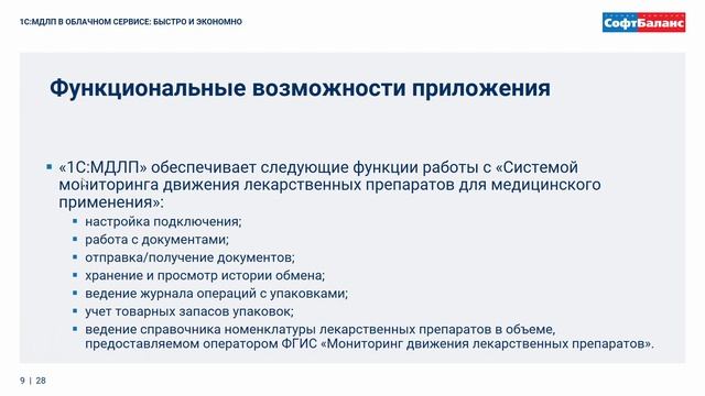 ГК "СофтБаланс" https://sb-vnedr.ru/ 1С:МДЛП в облачном сервисе: быстро и экономно Докладчик: Шпачук Евгений Алексеевич, ведущий специалист отдела продаж Департамента 1С:Франчайзинг ГК «СофтБаланс» Опыт внедрения МИС, задачи и результаты, отзывы: https://sb-vnedr.ru/introduced_projects/33/ Описание возможностей программ 1С:Медицина: https://sb-vnedr.ru/programm/1c-medicina/ https://youtu.be/2AC1YSRtKf4