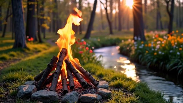 Приятный звук костра в утреннем лесу: Треск дров, журчание ручья и пение птиц