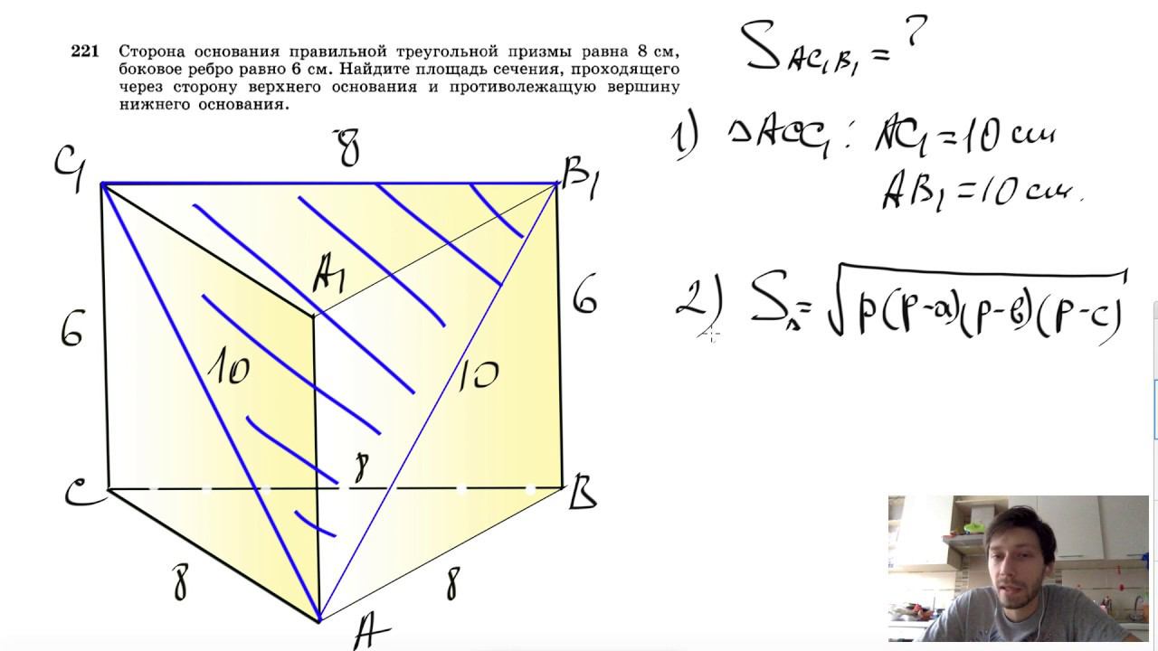 №221. Сторона основания правильной треугольной призмы равна 8 см, боковое ребро равно 6 см. Найдите площадь сечения, проходящего через сторону верхнего основания и противолежащую вершину нижнего основания. Поддержать канал рублём - 5469400944002125 (Сбербанк) Мой второй канал для подготовки к ЕГЭ и ОГЭ - https://www.youtube.com/ЕвгенийСумин Инстаграм - https://www.instagram.com/EGE_OGE.math Личный инстаграм - https://www.instagram.com/ee_sumin VK - https://vk.com/evgeniysumin FB - https://www.facebook.com/EvgeniySumin