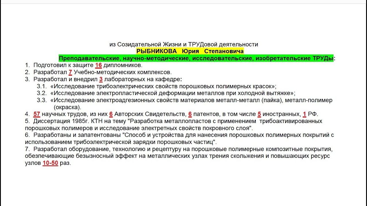 ПЕРЕЧЕНЬ ТРУДов (из Созидательной Жизни и ТРУДовой деятельности РЫБНИКОВА Ю. С.)две ССЫЛКИ под ВИДЕО