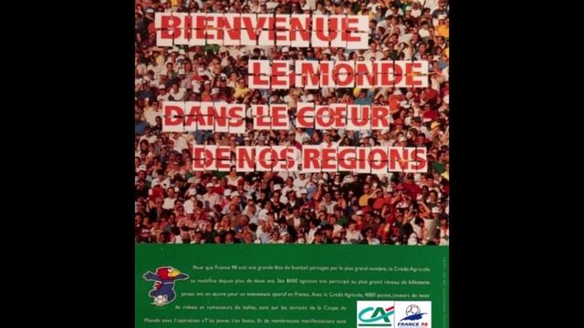 BIENVENUE LE MONDE, DANS LE COEUR, DE NOS REGIONS Pour que France 98 soir une grande fate du football partagee par le plus grand nombre, le Credit Agricole se mobilise depuis plus de deux ans. Avec le Credit Agricole, 4000 jeunes joueurs de lever rideau et ramusseurs de balles, som sur les terrains de la Coupe du Monde avec Гoperation eT'e: jeune, res foot». CREDIT AGRICOLE, BANQUE OFFICIELLE DE FRANCE 98.