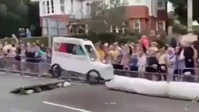 Короткий прикол про соревнования на самодельных автомобилях, в котором на очередном трамплине развалилась машина, одна из участниц.