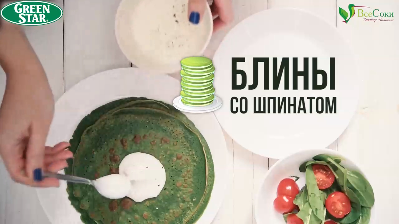 Для приготовления блинчиков со шпинатом потребуется: - 400 мл свежевыжатого зелёного сока (из 70 г молодых ростков и 1 кг шпината); - 200 г белой муки; - 2 яйца; - 1 ч. л. молотого чёрного перца; - Соль по вкусу. Готовые блинчики украсить томатами черри и листьями шпината. Видеоролик от 16.01.2018 Соковыжималка Tribest Green Star Elite GSE: Белого цвета: http://vsesoki.ru/collection/gorizontalnye-dvushnekovye/product/tribest-green-star-elite-gse-5000?rtube Белого цвета с насадкой для приготовления лапши из теста: http://vsesoki.ru/collection/gorizontalnye-dvushnekovye/product/tribest-green-star-elite-gse-5300?rtube Чёрного цвета: http://vsesoki.ru/collection/gorizontalnye-dvushnekovye/product/sokovyzhimalka-tribest-green-star-elite-gse-6000?rtube Хромированного цвета: http://vsesoki.ru/collection/gorizontalnye-dvushnekovye/product/sokovyzhimalka-tribest-green-star-elite-gse-5000-hrom?rtube http://vsesoki.ru?rtube – ООО «Все Соки», официальный импортёр и российский дистрибьютор техники Tribest и других лидеров в производстве техники для здорового образа жизни. ☎ Заказать шнековые соковыжималки, вакуумные упаковщики, домашние мельницы, профессиональные блендеры, автоматические проращиватели, надёжные дегидраторы, кухонные аксессуары и другую технику для здорового питания с бесплатной доставкой по РФ: +7 (495) 134-11-44 – в Москве +7 (812) 389-33-66 – в Санкт-Петербурге ⠀8 (800) 33-33-627 – по всей России (звонок бесплатный!) Сюрприз для подписчиков! Подпишитесь на наш канал https://rutube.ru/video/person/1735077 и при оформлении заказа на сайте «Все Соки» используйте секретное слово РУТУБ. Наглядная инструкция по использованию кодового слова: https://clck.ru/EtNNi