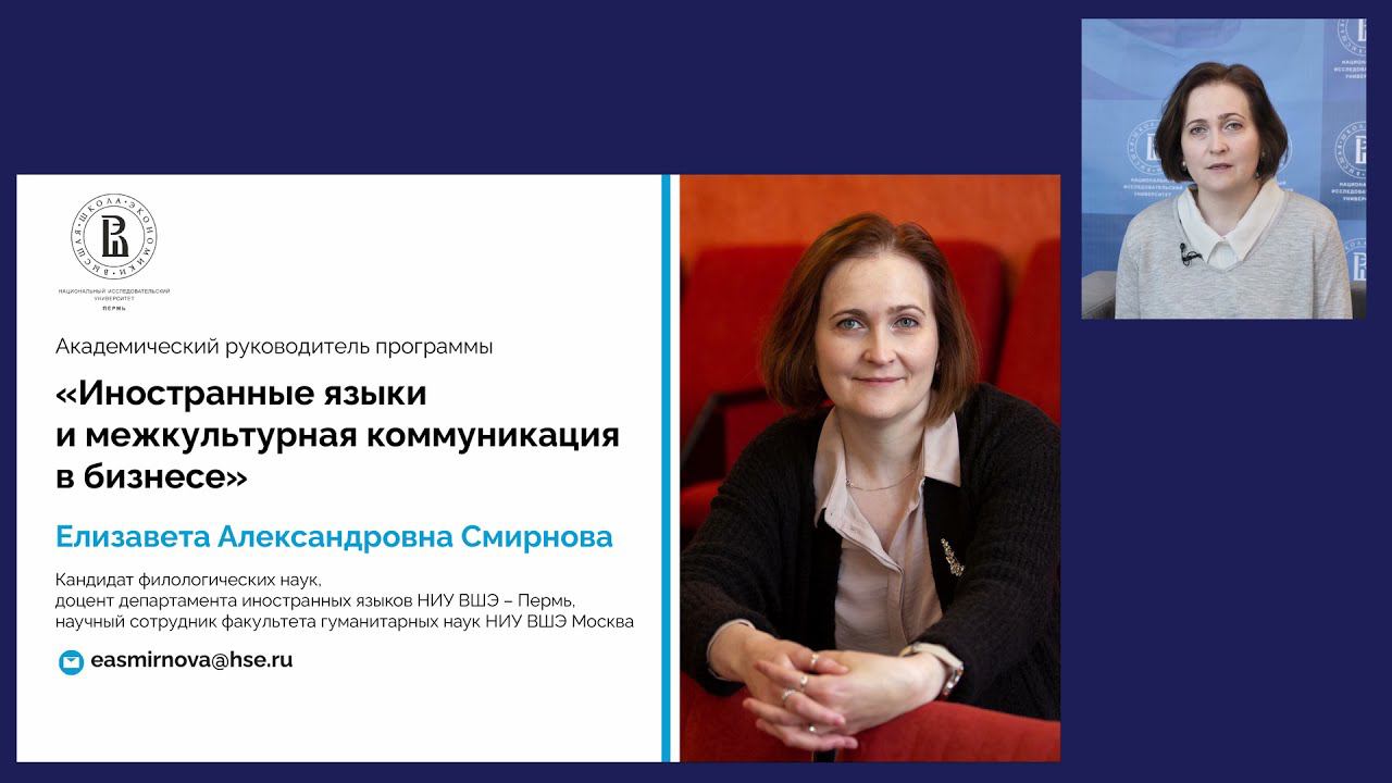 Академический руководитель программы бакалавриата НИУ ВШЭ – Пермь «Иностранные языки и межкультурная коммуникация в бизнесе» Елизавета Смирнова рассказывает о преимуществах обучения на программе, особенностях поступления и карьерных перспективах выпускников. Подробнее о программе: https://perm.hse.ru/ba/communication/ Группа абитуриентов бакалавриата НИУ ВШЭ – Пермь Вконтакте: https://vk.com/hseperm