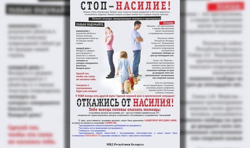 ➡️В период с 8 по 17 апреля на территории страны проводится республиканская профилактическая акция «Дом без насилия!». Соответствующий план проведения акции утвержден министрами внутренних дел, труда и социальной защиты, здравоохранения и образования. 💬Как отметил начальник управления охраны правопорядка и профилактики МОБ УВД Гомельского облисполкома полковник милиции Андрей Майсейков, основные усилия в период проведения акции будут сосредоточены на принятии системных мер по профилактике домашнего насилия, привлечения максимального количества заинтересованных субъектов профилактики к разрешению проблем, связанных с домашним насилием, оказанием помощи в трудоустройстве неработающих «семейных дебоширов», наркологической помощи – для злоупотребляющих спиртным, оказания помощи пострадавшим.