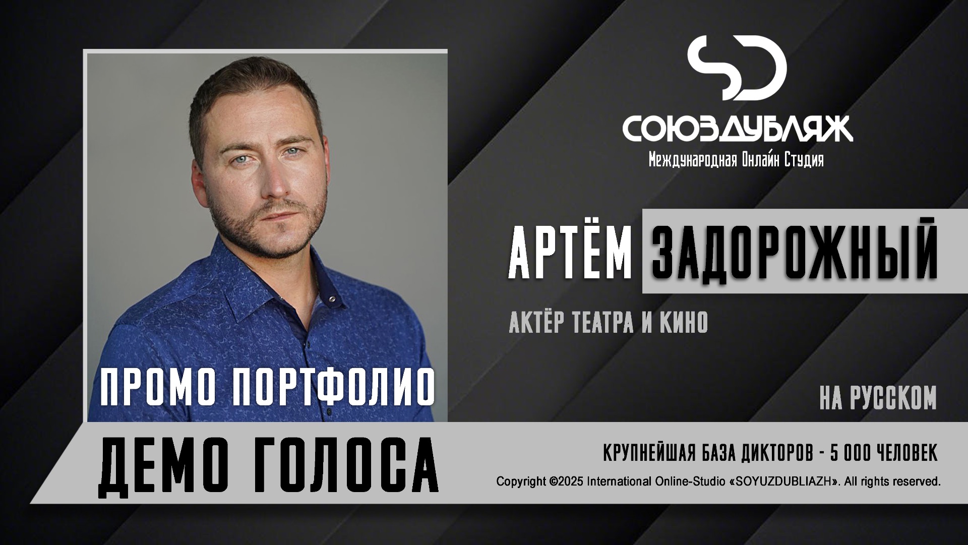 #СоюзДубляж #БазаДикторов #Озвучка ✔️Артём Задорожный, актёр дубляжа - диктор озвучивания. Международная Онлайн-Студия "СОЮЗДУБЛЯЖ" - профессиональная озвучка и дубляж. ▪️Рабочая группа в Телеграм: https://t.me/soyuzdubliazh ▪️Контакт для связи: https://t.me/SoyuzAdmin ▪️Подпишись:https://www.youtube.com/c/SOYUZDUBLIAZH ▪️Сайт: https://www.soyuzdubliazh.com/ Лучшие голоса для вашей аудиорекламы и видеороликов. База дикторов - 5 000 человек, профессионального уровня на ENG| FR| TR| RU| ISR| AZ| UA| KZ| UZ| языках. Мужские и Женские топовые голоса для озвучки любых проектов, таких как: Рекламы, Презентации, Фильмы, Сериалы, Игры, Мультфильмы, ТВ Шоу, Аудио-видео визитки. ✔️Сотрудничая с нами вы получаете свой проект под ключ, не выходя из дома или офиса. Наша слаженная команда из лучших дикторов, актёров озвучивания, режиссёров и звукорежиссёров в кратчайшие сроки озвучат или отдублируют ваш заказ на профессиональном уровне. Образцы работ нашего портфолио вы сможете посмотреть на канале СОЮЗДУБЛЯЖ. ВНИМАНИЕ: ✔️Мы приглашаем специалистов озвучки к сотрудничеству в нашей команде. Вы можете пройти по ссылке в наш телеграм канал и связаться с Админом для обсуждения. ✔️Всем заказчикам подобных медиа проектов по озвучки и дубляжу фильмов, сериалов, документалок обращаться непосредственно к Админу Телеграм группы СОЮЗДУБЛЯЖ, пройдя по ссылке: Проходи по ссылке: https://t.me/soyuzdubliazh International Online-Studio SOYUZDUDLIAZH presents a highly professional approach in voice-over and dubbing. ▪️Our working group https://t.me/soyuzdubliazh ▪️Chief manager https://t.me/SoyuzAdmin ▪️Follow https://www.youtube.com/c/SOYUZDUDLIAZH ▪️Web: https://www.soyuzdubliazh.com/ We offer You the best Voices for your Audio commercials and Video`s. Our Database contains over 5 000 voices of native speakers and high-class foreign language specialists in ENG| FR| TR| RU| ISR| AZ| UA| KZ| UZ|. Male & Female top level voices for all the variety of dubbing projects such as commercials, presentations, movies, TV-series, video and computer games, cartoons, TV-shows, audio & video portfolio’s – all in one place. As your business partner we guarantee a turn-key project without you leaving your house or office. Our target is to make sure that the dubbing of your project is made as quick as possible by a well-coordinated and professional team of the best speakers, film and sound directors. To whom it may concern! We invite dubbing specialists to join our team. Please contact our manager on Telegram https://t.me/soyuzdubliazh