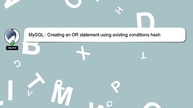 MySQL : Creating an OR statement using existing conditions hash To Access My Live Chat Page, On Google, Search for "hows tech developer connect" I promised to share a hidden feature with you, and here it is. This is a YouTube's feature which works on Desktop. First, Make sure this video is playing. Then, type the letters 'awesome' on the keyboard. Your YouTube progress bar will transform into a flashing rainbow. Let me give you a brief introduction of who I am, Hey, I'm known as Delphi. Allow me to provide support in answering your questions. MySQL : Creating an OR statement using existing conditions hash I encourage you to reach out through comments or chat if you have more specific questions. If you have knowledge to contribute or an answer to provide, we encourage you to comment below. Your answer will be recognized and valued, and I will 'heart' it to show my appreciation. Creating existing MySQL hash conditions statement using : OR an