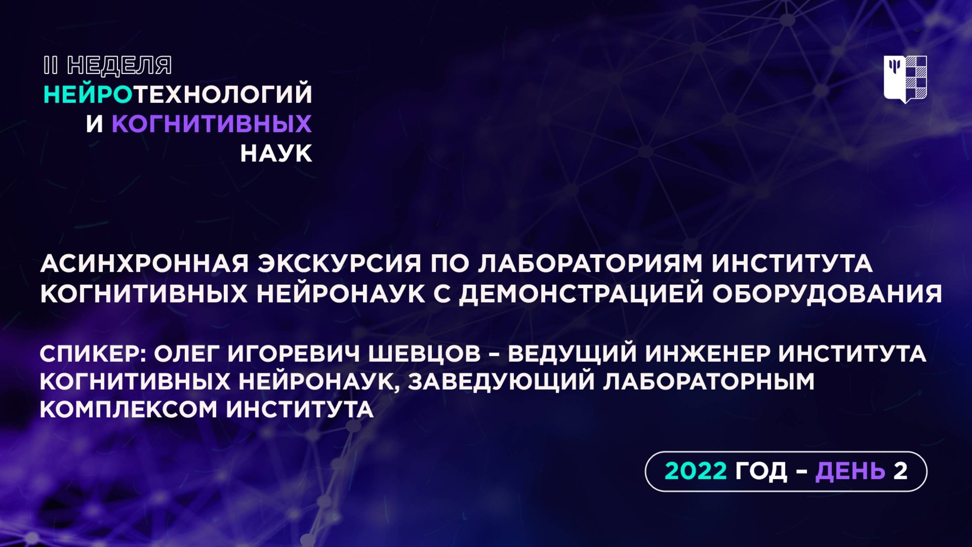II Неделя Нейротехнологий и когнитивных наук 19 апреля Асинхронная экскурсия по лабораториям Института Когнитивных Нейронаук с демонстрацией оборудования Спикер: Олег Игоревич Шевцов - ведущий инженер Института Когнитивных Нейронаук, заведующий лабораторным комплексом Института