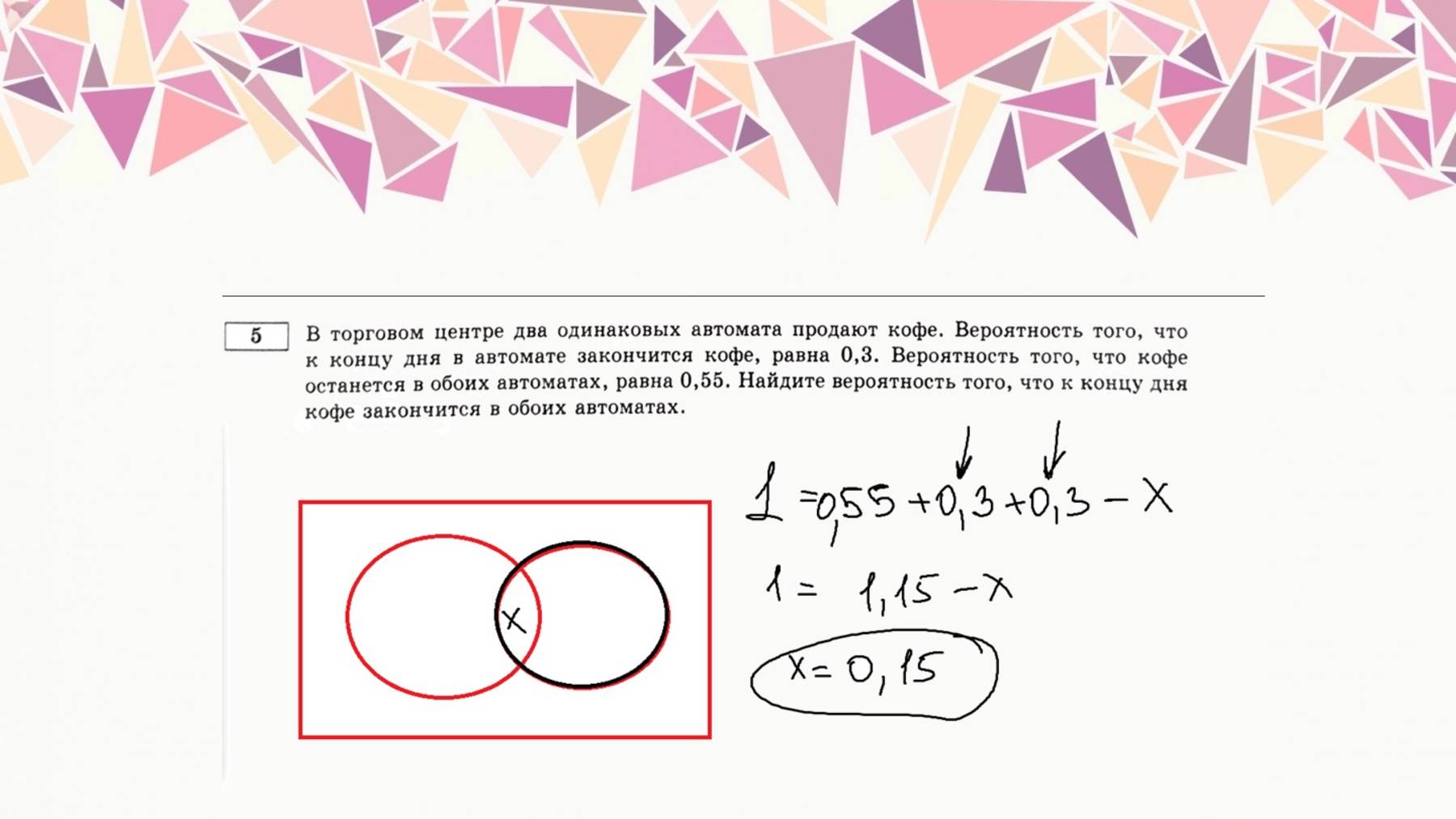 В торговом центре два одинаковых автомата продают кофе. Вероятность того, что к концу дня в автомате закончится кофе, равна 0,3. Вероятность того, что кофе останется в обоих автоматах, равна 0,55. Найдите вероятность того, что к концу дня кофе закончится в обоих автоматах