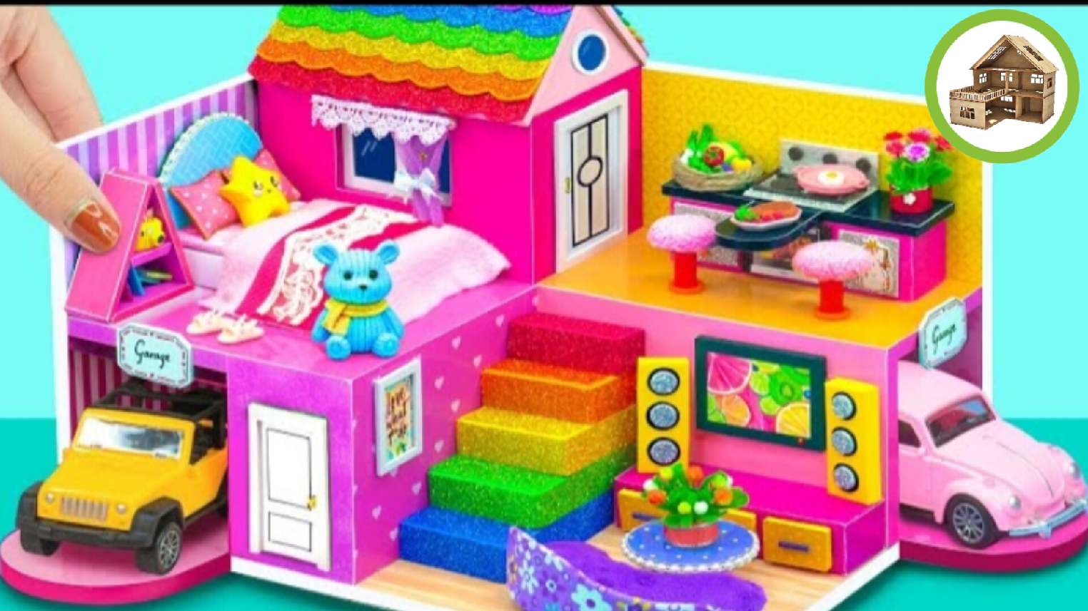 Миниатюрный трех этажная вилла соврименными комнатами и с двумя гаражами для машин из картона /268