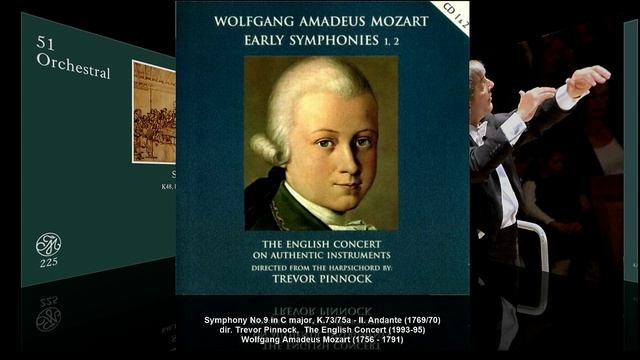 В.А. Моцарт. Все симфонии. Вып. 9-7 Wolfgang Amadeus Mozart (1756 - 1791) – Symphony No. 9 in C major, K. 73/75a (1769/70) - Minuet in A major, K.61g/I, 1770 (The Academy of Ancient Music / Christopher Hogwood (1979-86) Вольфганг Амадей Моцарт (1756 - 1791) – Симфония No.9 до мажор, KV 73/75a (1769/70) C-dur ■ en ut majeur ■ до мажор - Менуэт ля мажор KV 61g/I, 1770 (Academy of Ancient Music / Кристофер Хогвуд (1979-86) A-dur ■ en la majeur ■ ля мажор Minuet in A major, K.61g/I, 1:12 Symphony No. 9 in C major, I. Allegro 3:05 II. Andante 4:22 III. Menuetto & Trio 3:16 IV. Molto allegro 2:02 dir. Trevor Pinnock / дир. Тревор Пиннок The English Concert / Барочный оркестр ‘The English Concert’ 1993-1995 Симфония № 9 до мажор, K. 73/75a Вольфганга Амадея Моцарта не имеет точной датировки написания. Наиболее вероятная дата ее создания - конец 1769 или 1770 года, во время первого итальянского путешествия Моцарта, хотя некоторые авторитетные исследователи датируют ее, правда с оговоркой, как «вероятно, не ранее начала лета 1772 года» (запись в википедии «вероятно была написана в июле 1772 года в Зальцбурге между его вторым и третьим итальянскими путешествиями»). Возможно, она было начата еще в Зальцбурге до начала первого итальянского путешествия и завершена во время путешествия. Симфония состоит из четырех частей и является первой симфонией Моцарта в тональности до мажор. Нет информации о том, на каком из многих итальянских концертов, данных Моцартами во время этого турне, эта симфония была исполнена впервые. Партитура с автографом сегодня хранится в Ягеллонской библиотеке в Кракове (Biblioteka Jagiellońska in Kraków). Симфония написана для 2-х гобоев, фагота, 2-х валторн, 2-х труб, литавр, клавесина и струнных. Симфония состоит из четырех частей: 1. Allegro, 4/4 2. Andante, 2/4 3. Menuetto and Trio, 3/4 4. Molto allegro, 2/4. . Тревор Дэвид Пи́ннок (англ. Trevor David Pinnock, 16 декабря 1946, Кентербери) — британский клавесинист и дирижёр, представитель движения аутентичного исполнительства. Записал с ансамблем все клавесинные концерты Баха и все симфонии Моцарта. Как солист записал все сонаты Скарлатти, клавесинные пьесы и сюиты Рамо, Корелли, Бёрда. Вместе со скрипачкой Рэйчел Поджер записал баховские сонаты для скрипки и клавесина. Исполняет и новейшую музыку (клавесин