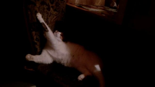 Кошка наелась и отыгрывается на стуле