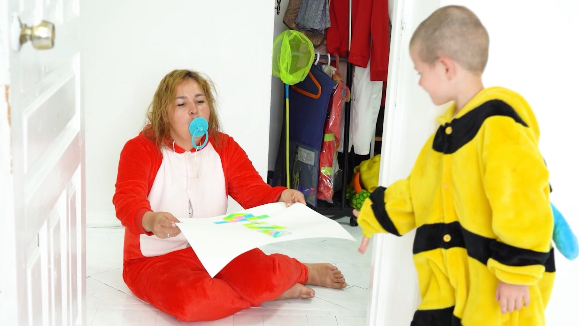 Ребенок нянчится с мамой соска во рту кормит кашей и играет с конструктором