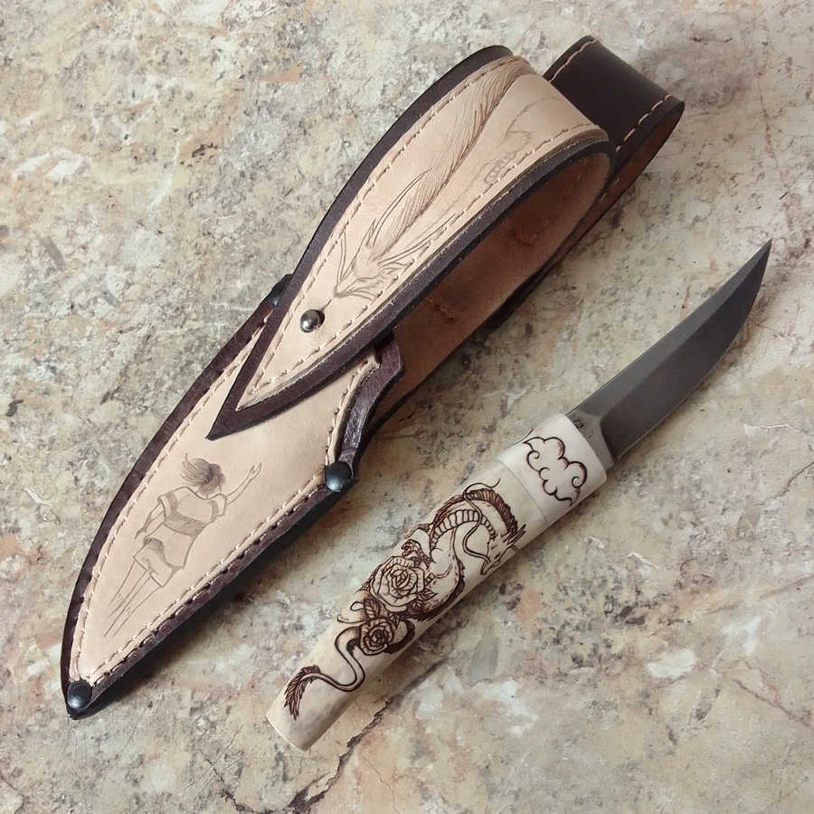 Представляем приятный и очень удобный нож, за основу для декорирования которого взяли один из самых популярных мультфильмов японского режиссёра Хаяо Миядзаки "Унесённые призраками", где главные персонажи - это девочка по имени Тихиро (ударение на последний слог) и заколдованный дракон Хаку. Получился отличный инструмент для мелких работ во время активного отдыха и просто для души. Пользуйтесь с удовольствием! Модель: Коготь Монтаж: сквозной Клинок: кованая сталь х12мф (твёрдость 60 HRC), ромбовидное сечение клинка, спуски вогнутой линзой и далее режущая кромка Рукоять: рог лося Декорирование: следы ковки, выжигание по рукояти и ножнам Не является ХО, сертификат имеется, ножны в комплекте. Размеры в мм: Общая длина - 187 Длина-ширина-толщина клинка - 85-18-3,5 Длина-ширина-толщина рукояти – 102-24-23 ЦЕНА на момент публикации: 10000 р, + доставка (почта, СДЭК) ВНИМАНИЕ!! Вся наша продукция - это ручная работа, а если Вам понравилась модель ножа, но хочется его в каком-то другом исполнении, обращайтесь – договоримся. По всем вопросам и заказу ножей обращайтесь: Олег Александрович Киршанов (директор по развитию ООО «Ножеяр») Тел/whatsapp +79202979792 (c 8 до 19 ч МСК) Вконтакте https://vk.com/nozheyaaar Ярмарка мастеров https://www.livemaster.ru/nozheyaaar Инстаграмм https://www.instagram.com/nozheyaaar НОЖЕЯР: хорошие ножи для хороших людей!!