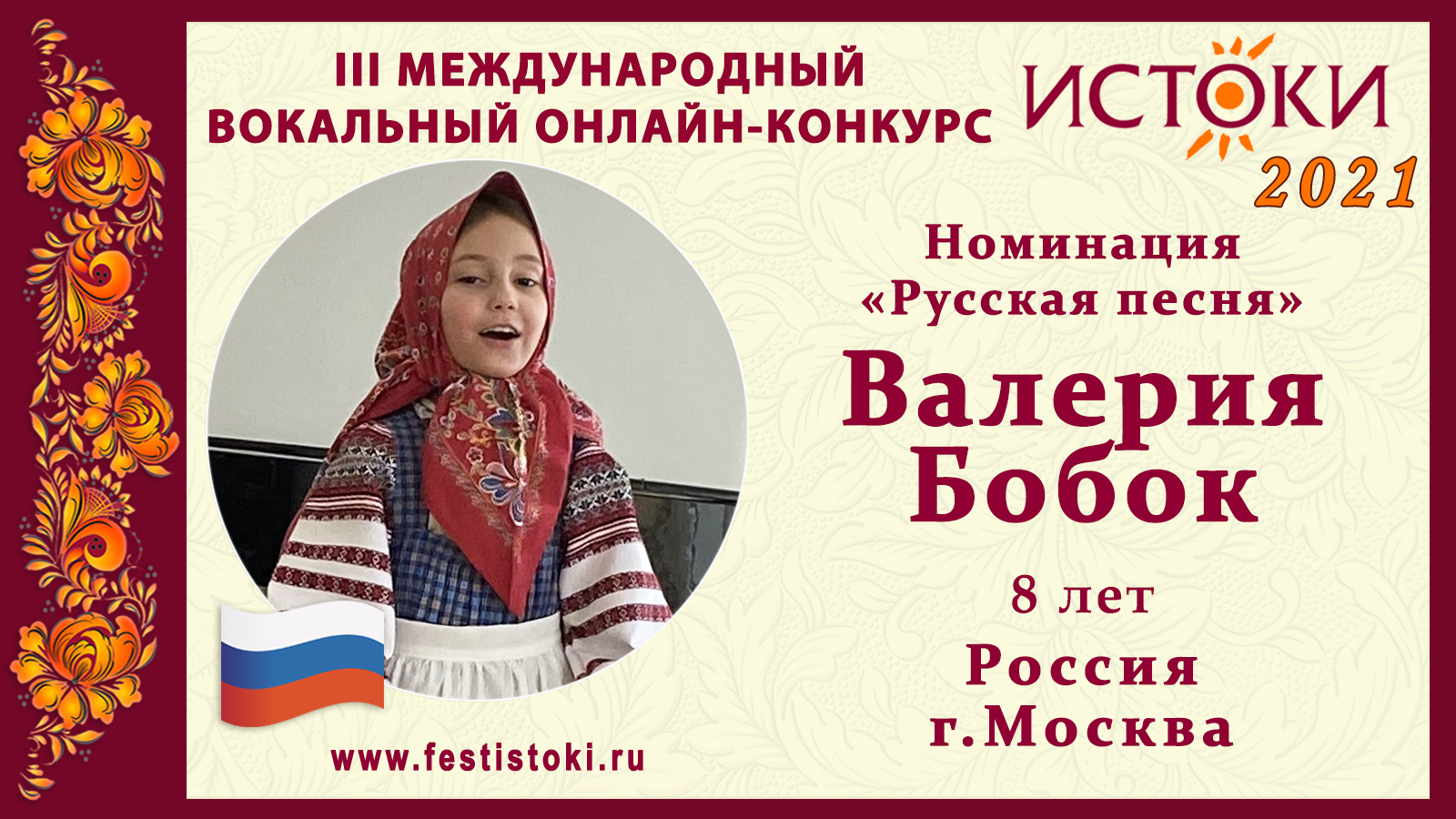 Лауреат II степени III Международного вокального онлайн-конкурса «Истоки». Номинация "Русская песня". Закличка Калужской области "Медуница луговая" Сайт: www.festistoki.ru / www.festistoki.com E-mail: festistoki@mail.ru