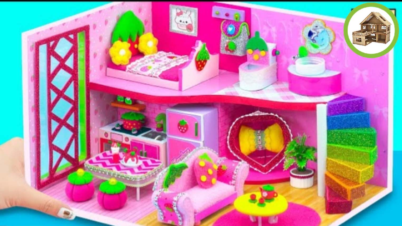 Клубничный миниатюрный домик с ванной комнатой, и кухней для всей семьи из картона /238