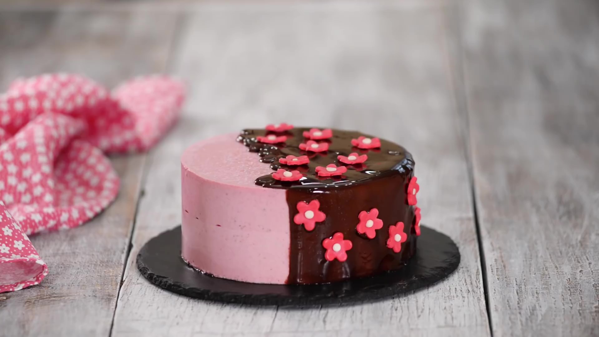 Ингредиенты: «Вес торта — 1200 гр.» Для бисквита: Мука — 110 г. Сахар — 125 г. Какао-порошок — 35 г. Разрыхлитель — 3 г. Пищевая сода — 2 г. Соль — щепотка Яйцо — 1 шт. Растительное масло — 30 г. Кефир — 100 г. Кипяток — 85 мл. Ванильный экстракт — 1 ч.л. Для клубничного мусса: Желатин — 14 г. Холодная вода — 80 мл. Клубничное пюре — 400 г. Сахар — 120 г. Охлаждённые сливки 33-35% — 300 мл. • Шоколадная зеркальная глазурь — «Видео как делать шоколадную зеркальную глазурь, есть на канале» Для украшения: Цветы из мастики Ингредиенты для бисквита должны быть комнатной температуры. 1. Разогреть духовку до 170 °С. 2. Приготовить шоколадный бисквит. В миске смешать муку, какао-порошок, разрыхлитель, пищевую соду и соль. Отложить в сторону. 3. Яйцо соединить в миске с сахаром и взбить миксером добела, на максимальной скорости. Масса должна посветлеть и увеличиться в объёме. Затем добавить ванильный экстракт, растительное масло и кефир, взбить до однородности. Постепенно ввести сухие ингредиенты и кипяток, взбить до однородной массы. 4. Готовое тесто вылить в форму диаметром 16 см., застеленную пергаментной бумагой. Выпекать в разогретой духовке 35-40 минут. Готовность бисквита проверить деревянной шпажкой, если при прокалывании она выходит чистой из бисквита — значит он готов. 5. Готовый бисквит вынуть из духовки и дать остыть в течение 10 минут. Затем вынуть из формы и дать полностью остыть на решётке. 6. Разрезать бисквит на 2 части. 7. Приготовить клубничный мусс. Желатин залить холодной водой и оставить на 10 минут для набухания. Клубничное пюре соединить с сахаром в сотейнике, на среднем огне довести до кипения. Снять с огня, добавить разбухший желатин и хорошо перемешать до полного растворения желатина. Перелить в чистую миску и остудить до 35 ºC. Охлаждённые сливки взбить до средних пиков и постепенно ввести в клубничное пюре. 8. Собрать торт. Дно раздвижного кольца диаметром 18 см., затянуть фольгой или полиэтиленовой плёнкой. Стенки проложить бумагой для выпечки или кондитерской ацетатной плёнкой, кольцо положить на ровную поверхность, например разделочную доску. В раздвижное кольцо поместить первый корж, сверху вылить половину мусса и убрать в холодильник на 10-15 минут. Достать из холодильника, в середину положить второй корж и вылить оставшийся клубничный мусс. Убрать торт в морозильную камеру на 6-8 часов. 9. Приготовить зеркальную шоколадную глазурь по указанному рецепту. 10. Замороженный торт извлечь из формы и переложить на решётку, под решётку положите тарелку, чтобы излишки глазури в неё стекали. Половину торта покрыть зеркальной глазурью, переложить торт на блюдо и убрать в холодильник на 4 часа, до полной разморозки. 11. Готовый торт по желанию украсить цветами из мастики.