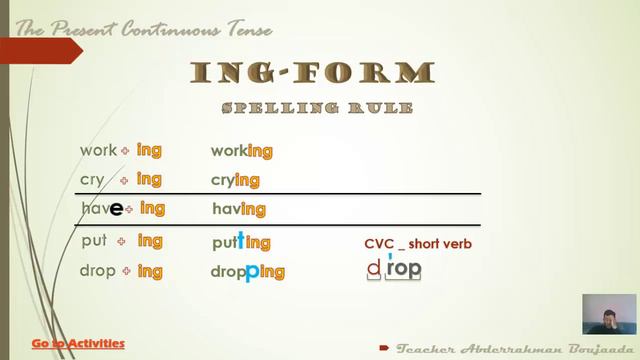 Such actions which are happening at time of speaking are expressed by present continuous tense. Present Continuous tense is also called Present progressive tense. Rules. Auxiliary verb “am or is or are” is used in sentence. 1st form of verb or base verb + ing (present participle) is used as main verb in sentence. The present continuous, also called the present progressive or present imperfect, is a verb form used in modern English that combines the present tense with the continuous aspect. It is formed by the present tense form of be and the present participle of a verb. The present continuous verb tense indicates that an action or condition is happening now, frequently, and may continue into the future. The Present Continuous Formula: to be [am, is, are] + verb [present participle] to describe an action that is going on at this moment: You are using the Internet. You are studying English grammar. to describe an action that is going on during this period of time or a trend: Are you still working for the same company? More and more people are becoming vegetarian. to describe an action or event in the future, which has already been planned or prepared: We're going on holiday tomorrow. I'm meeting my boyfriend tonight. Are they visiting you next winter? to describe a temporary event or situation: He usually plays the drums, but he's playing bass guitar tonight. The weather forecast was good, but it's raining at the moment. with "always, forever, constantly", to describe and emphasise a continuing series of repeated actions: Harry and Sally are always arguing! You're constantly complaining about your mother-in-law! (also called Present Progressive) We often use the Present Continuous tense in English. It is very different from the Present Simple tense, both in structure and in use.