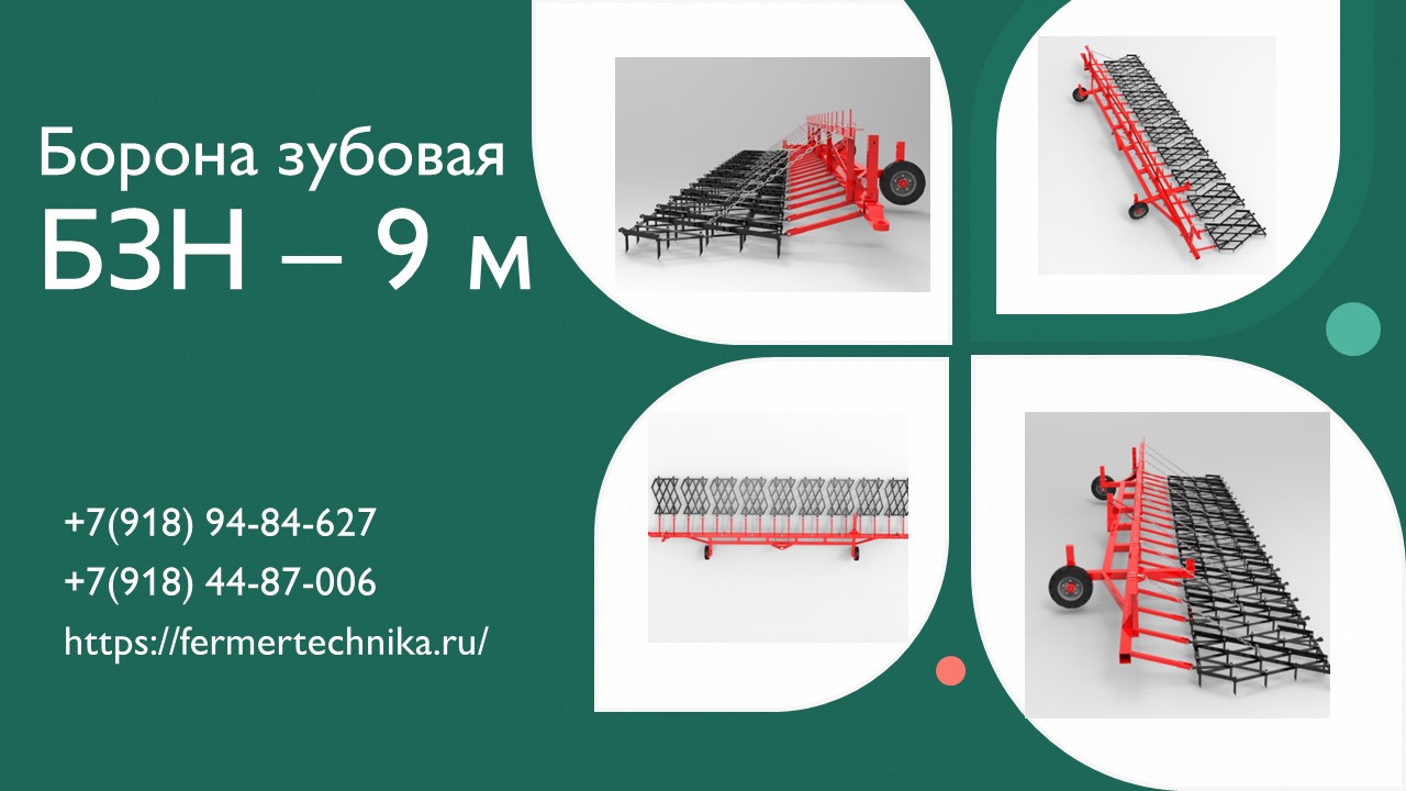 Борона зубовая предназначена для рыхления верхнего слоя почвы, выравнивания поверхности поля, дробления комков, уничтожения всходов сорняков и разрушения почвенной корки, боронования всходов зерновых и технических культур на повышенных скоростях. Характеристики: Рама: 100х100х6 мм. Габариты: 945/290/105 см Вес: 910 кг. Требуемая мощность трактора: От 40 л. с. Рабочая ширина: 9.0 м. Рабочая глубина: до 6 см. Расстояние между опорными колесами - 525 см Колеса - 5.00-10 (2 шт) Крепление под автосцепку Страна-производитель: Россия Борона зубовая в комплекте: Да Количество зубовых борон - 9 шт Транспортное устройство в комплекте Ссылки для приобретения: https://fermertechnika.ru/borona-zubovaya-bzn/borona-zubovaya-bzn-9kupit-boronu-zubovuyu https://www.avito.ru/kalininskaya/gruzoviki_i_spetstehnika/borona_fermer_tehnika_bzn_2024_3639389602 Отдел продаж: +7(918)94-84-627, +7(918)44-87-006 353780, Краснодарский край, ст. Калининская, ул. Степная 3"А"