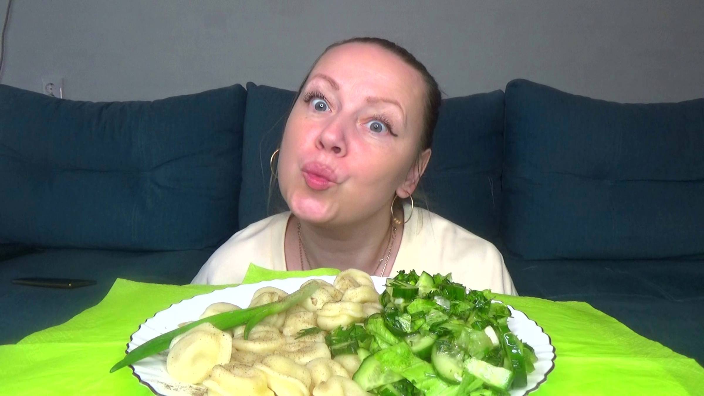 Мукюанг пельмени и вкусный зеленый овощной салат. Еда гна камеру.