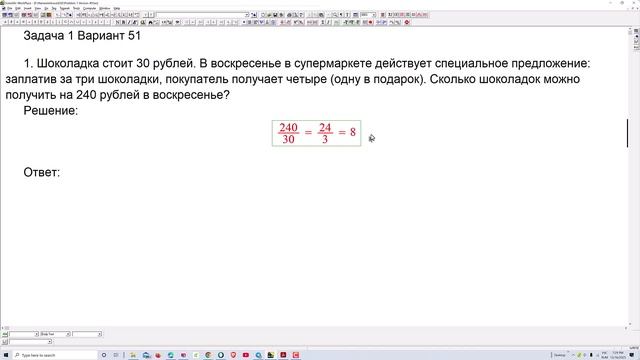 Шоколадка стоит 30 рублей. В воскресенье в супермаркете действует специальное предложение: заплатив за три шоколадки, покупатель получает четыре (одну в подарок). Сколько шоколадок можно получить на 240 рублей в воскресенье? ТГК https://t.me/laranam ВК https://vk.com/laraname ОК https://ok.ru/group/70000033283777 #репетиторматематика #огэ #репетиторпоматематике #огэ #математика #репетитор