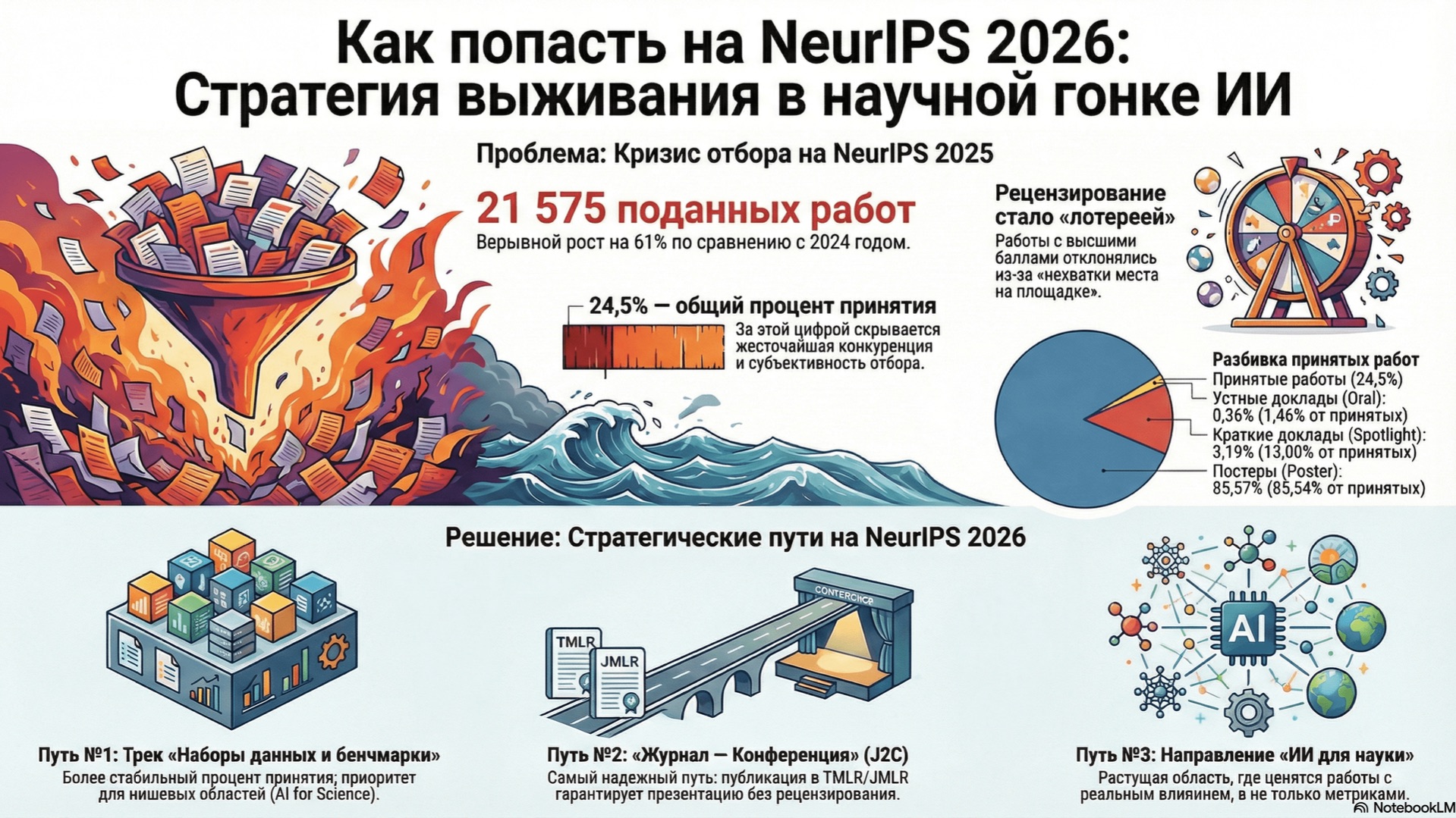 Документ представляет стратегический анализ конференции NeurIPS 2025, которая столкнулась с «цунами заявок» — 21 575 валидных работ, что на 61% больше, чем в 2024 году, серьезно нагрузив систему рецензирования. Несмотря на общий процент принятия в 24,52%, доля устных докладов была минимальной (0,36%), а многие высокооцененные работы были отклонены из-за ограниченности места и субъективных решений председателей областей. Это указывает на трансформацию NeurIPS из академического форума в глобальную индустриальную выставку, влияющую на качество экспертизы. Отчет выделяет ключевые исследовательские приоритеты NeurIPS 2025, включая масштабирование глубины в самообучающемся обучении с подкреплением, оптимизацию механизмов внимания для эффективных больших языковых моделей (LLM) с промышленной применимостью, а также теоретические прорывы в генеративных диффузионных моделях. Анализируя эти тенденции и характеристики успешных работ, отчет стремится определить предсказуемые траектории для успешной подачи материалов на NeurIPS 2026 в Сиднее. #NeurIPS2025 #NeurIPS2026 #ИсследованияИИ #МашинноеОбучение #АнализКонференций #ГлубокоеОбучение #БЯМ #ОбучениеСПодкреплением #ДиффузионныеМодели #ПодачаСтатей документ - https://t.me/arxivpaper подписаться - https://t.me/arxivpaperu отправить донаты: USDT: 0xAA7B976c6A9A7ccC97A3B55B7fb353b6Cc8D1ef7 BTC: bc1q8972egrt38f5ye5klv3yye0996k2jjsz2zthpr ETH: 0xAA7B976c6A9A7ccC97A3B55B7fb353b6Cc8D1ef7 SOL: DXnz1nd6oVm7evDJk25Z2wFSstEH8mcA1dzWDCVjUj9e создано с помощью NotebookLM