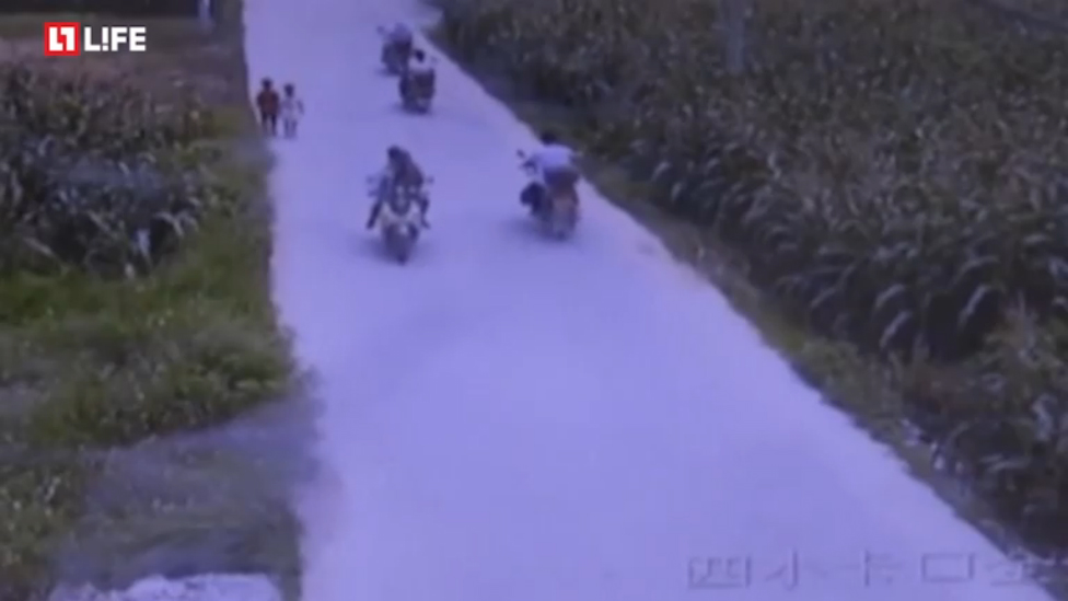 Китай. Шестилетняя девочка попала под колёса мотоцикла по пути в школу в китайском районе Гуанси. На кадрах, она идёт по дороге вместе с другом, а мимо проезжают байкеры. В какой-то момент школьница переходит на другую сторону дороги, а несколькими секундами позже бегом возвращается обратно к своему товарищу, и в этот момент её на полном ходу сбивает мотоцикл. К счастью, маленькая жительница Китая серьёзно не пострадала и смогла даже сразу после происшествия встать и как ни в чём не бывало пойти дальше. Однако позже она всё-таки была госпитализирована.