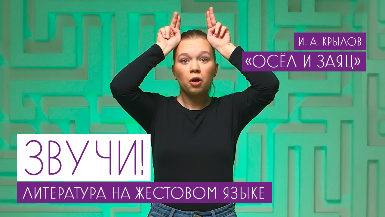 Проект "Звучи!" Литература на жестовом языке "Осёл и заяц, И. А. Крылов". "Звучи!" – образовательный проект дистанционного обучения, в котором русская литература переведена на язык жестов профессиональными глухими и слабослышащими актерами. Язык жестов считается официальным вторым языком для людей с проблемами слуха, однако в школах для глухих и слабослышащих литературу преподают исключительно в формате чтения с листа – на уроках дети не читают по памяти стихотворения и не цитируют прозу на том языке, на котором они привыкли думать и общаться между собой – на языке жестов. Но читать стихотворение и позволить ему "прозвучать" на языке жестов – совершенно разные по эмоциональному накалу – переживания. Проект призван помочь дошкольникам, учащимся и взрослым – усвоить школьную программу по литературе по-новому.