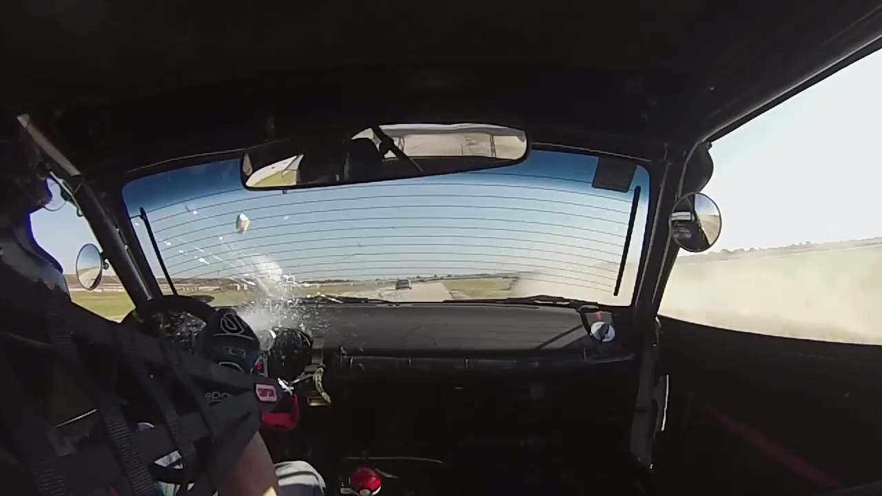 Во время гоночного заезда впереди едущий автомобиль вылетел на обочину и швырнул таким образом камень в лобовое стекло едущего сзади гонщика. #камень#обочина#гонки
