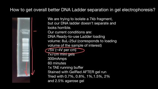 To achieve good separation of leader bands in gel electrophoresis, here are some key considerations and techniques: Gel concentration: Adjusting the concentration of the polyacrylamide or agarose gel can help optimize the separation of leader bands. Lower gel concentrations generally provide better resolution for larger DNA fragments, while higher concentrations are suitable for smaller fragments. Experimenting with different gel concentrations can help find the optimal conditions for your specific samples. Gel percentage gradient: Implementing a gradient gel can provide improved resolution for leader bands. Gradient gels have varying concentrations of polyacrylamide or agarose across the gel, with a lower concentration at the top and a higher concentration at the bottom. This gradient allows for better separation of fragments with different molecular weights. Sample preparation: Ensure that the DNA samples are properly prepared before loading them onto the gel. This includes appropriate DNA purification techniques to remove contaminants, minimizing the presence of RNA or protein contaminants, and using suitable DNA loading dyes or markers to visualize the samples during electrophoresis. Loading volume and well size: Optimizing the loading volume of DNA samples is crucial to avoid overcrowding and distortion of the leader bands. Be mindful of the volume loaded into each well, ensuring that it is within the recommended range for the specific gel size and well dimensions. Using appropriate-sized wells can also prevent overcrowding and promote better separation. Electrophoresis conditions: Adjusting the electrophoresis conditions, such as voltage, run time, and buffer composition, can impact the separation of leader bands. Higher voltages may result in faster migration but could compromise resolution, so it's essential to find the right balance. Additionally, maintaining stable and consistent electrophoresis conditions throughout the run is crucial for reproducibility and reliable results. Gel staining and visualization: Use appropriate DNA stains, such as ethidium bromide or fluorescent dyes, to visualize the leader bands. Following electrophoresis, ensure proper staining and destaining protocols to enhance band visibility and minimize background noise. Remember that optimal separation may require some trial and error, as it can vary depending on the specific DNA fragments and experimental conditions. It's advisable to run controls, such as DNA ladders or known samples, alongside your samples to assess the quality of separation and compare results. https://www.youtube.com/watch?v=GBW3UM6NsUg