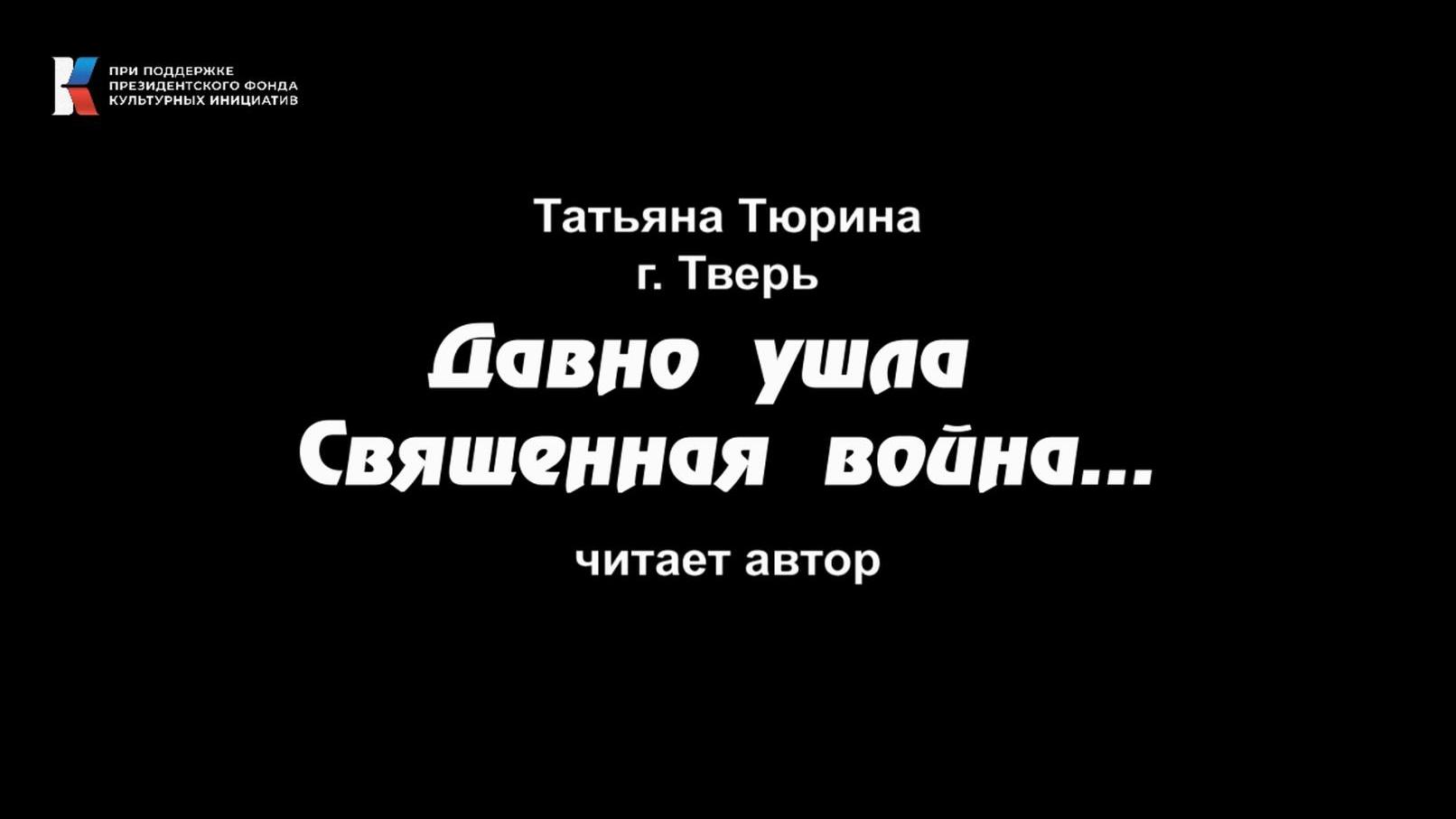 Татьяна Тюрина, г. Тверь "Давно ушла Священная война..." читает автор ---------------------- Видео опубликовано на ресурсах акции "Позывной – Россия! Стихи и песни нового времени" с личного разрешения автора и не нарушает авторских и смежных прав. Положение об онлайн-акции "Позывной Россия": http://pskovpisatel.ru/?p=267388 #ПозывнойРоссия #МыВместе #Z #ФондКультурныхИнициатив #донбассзанами #СвоихНеБросаем