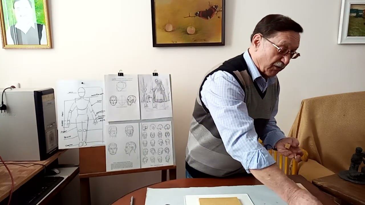 В четвёртом уроке педагог объясняет, как подготовить и облепить каркас фигурки пластилином перед дальнейшей проработкой формы. Ребятам напоминают, что каркас уже сделан, и теперь его нужно закрыть небольшими кусочками пластилина, чтобы проволока была надёжно зафиксирована и не расходились скрутки. Пластилин заранее нарезают на кусочки и разогревают в ладони, чтобы он стал мягче и удобнее в работе. Облепка выполняется не слишком толстым слоем: задача этого этапа — лишь спрятать проволоку и закрепить конструкцию, а не сразу набрать окончательный объём. Отмечается, что принцип работы с каркасом для человека и животного одинаковый, и после завершения равномерной облепки можно переходить к дальнейшему набору массы и формированию фигуры. Автор - художник Гончаров Николай Васильевич (1944-2025)
