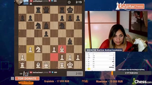 Титульный вторник на chess.com 11 туров 3+1 Поддержать канал: https://www.donationalerts.com/r/karinachess1 Подписаться на мой канал: https://www.youtube.com/channel/UChor8u_hhgrjX2lt0QLzZHA?sub_confirmation=1 Стать спонсором канала: https://www.youtube.com/channel/UChor8u_hhgrjX2lt0QLzZHA/join Обучающий курс "Пешечные структуры" http://bit.do/pawns-structures Рестрим: https://www.twitch.tv/karinachess1 Рада приветствовать Вас на канале женского международного гроссмейстера, международного мастера Карины Амбарцумовой! Я - профессиональная шахматистка и тренер. Здесь вы сможете найти обучающие видеоуроки по шахматам, комментарии турниров, стримы моей игры в блиц шахматы. Подписывайтесь на мои странички в соц.сетях: ВКонтакте: https://vk.com/karinachessclub Twitch: https://www.twitch.tv/karinachess1 Почта для связи: karinachess@mail.ru Поддержать канал: https://www.donationalerts.com/r/karinachess1 Мой сайт: http://chesscoach.ru/