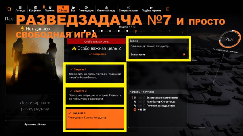 Письменные "тайм_коды")): 1. Задание - Освободить контрольную точку "Кладбище такси" в Фогги-Боттом. 2. Завершить операцию на острове Рузвельта на любом уровне сложности. 3. Ликвидация: Коннор Колдуотер