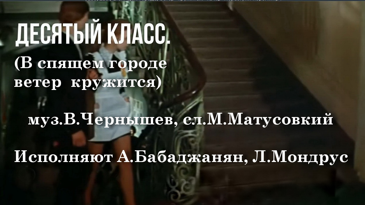 "Десятый класс" (В спящем городе, ветер кружится) - Муз.В.Чернышев, сл.М.Матусовкий. Исполняют А.Бабаджанян, Л.Мондрус. Удачи!