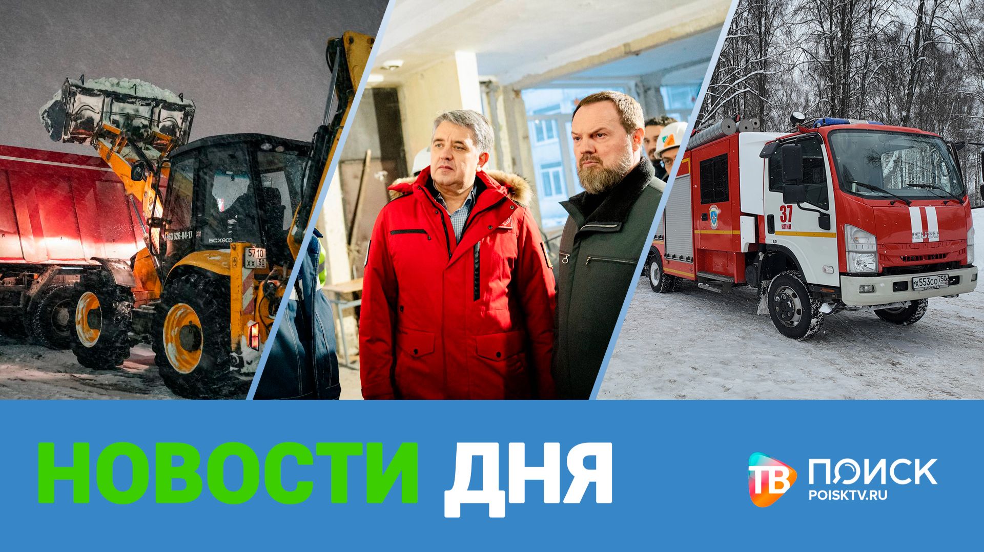 * В полной готовности. Коммунальные службы округа дают отпор снежным заносам . Обстановку по районам контролируют каждые два часа. * Учреждения образования - на контроле. Депутат Государственной Думы Сергей Колунов посетил сразу два учебных заведения. * Блокадный хлеб. В этом году исполняется 82 года со дня знаменательного исторического события в Ленинграде. Патриотическая акция прошла сегодня в Клину у клуба "Стекольный". * Важно выбрать свое дело. Накануне Дня студентов активисты партии Единая Россия провели тематическую встречу в клинском филиале РГСУ. Об этом и не только в программе "Новости дня"